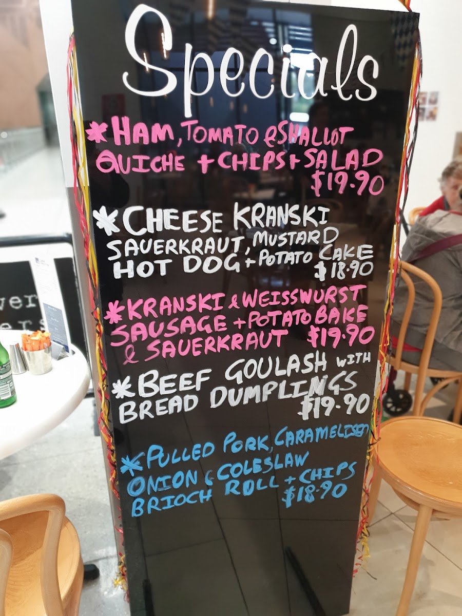 Food items generally include light meals and snacks, with a noted specialty such as the Kransky Weisswurst Sauerkraut and Potato Bake. Customers can expect options that align with casual dining and quick orders.